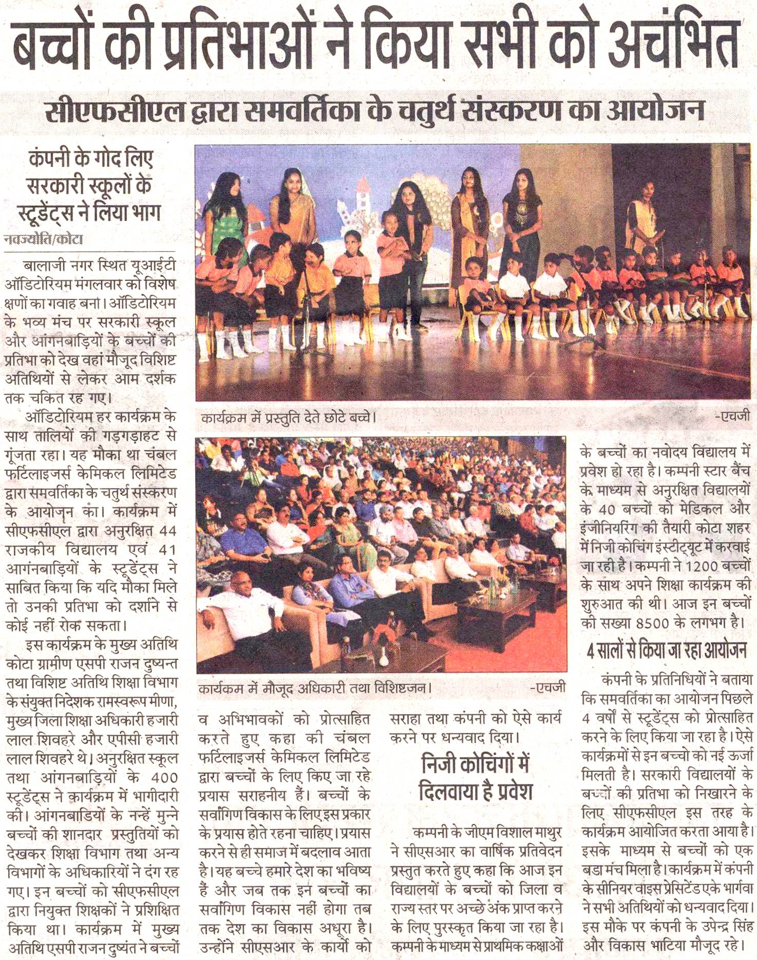 The Education department, Government of Rajasthan has felicitated "Chambal Fertilisers and Chemicals Ltd." with the state level Bhamashah Award ‘Shiksha Vibhushan’ for the contribution made in the field of Corporate Social Responsibility” in the Kota District.
